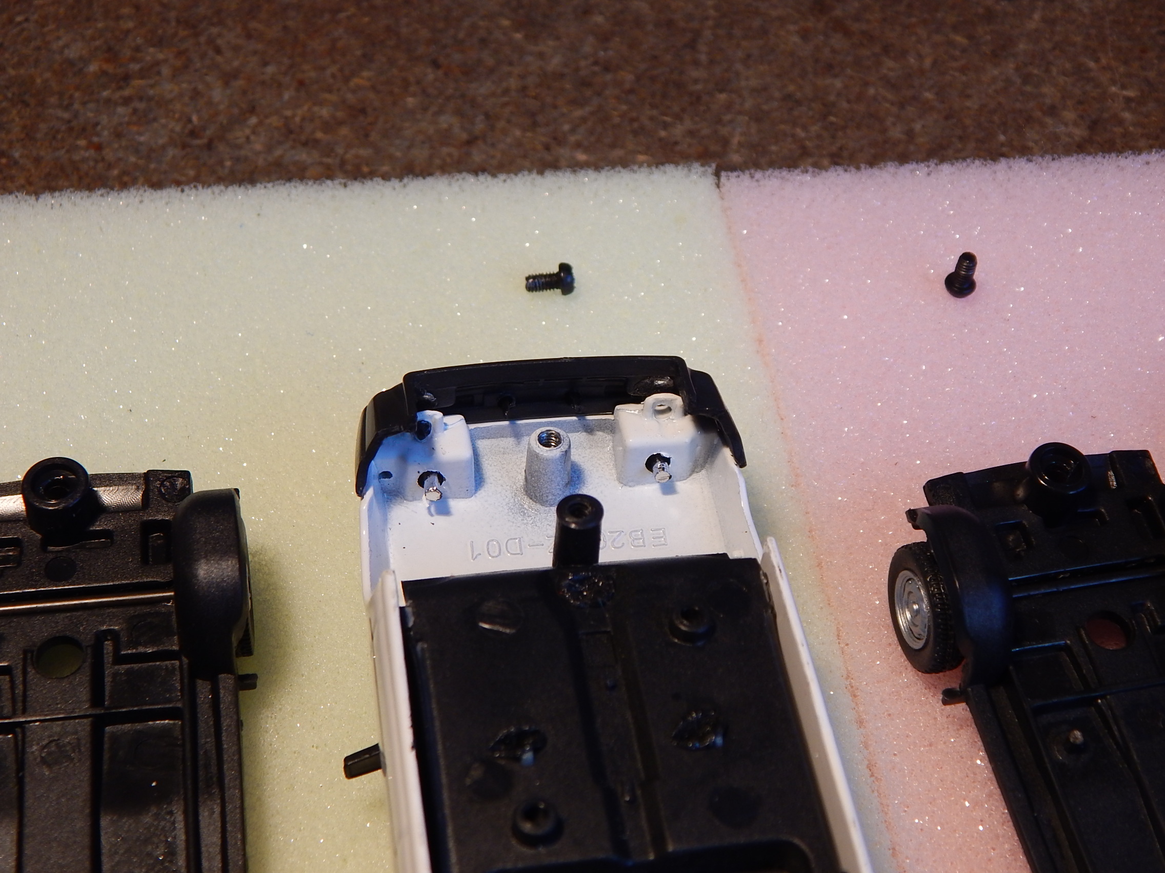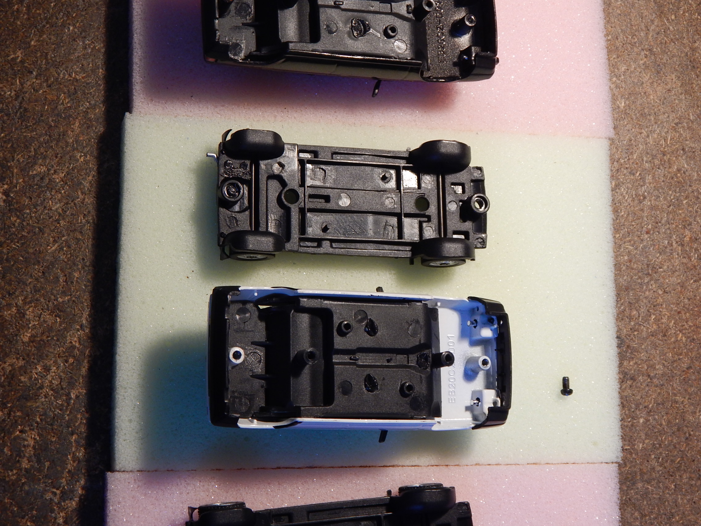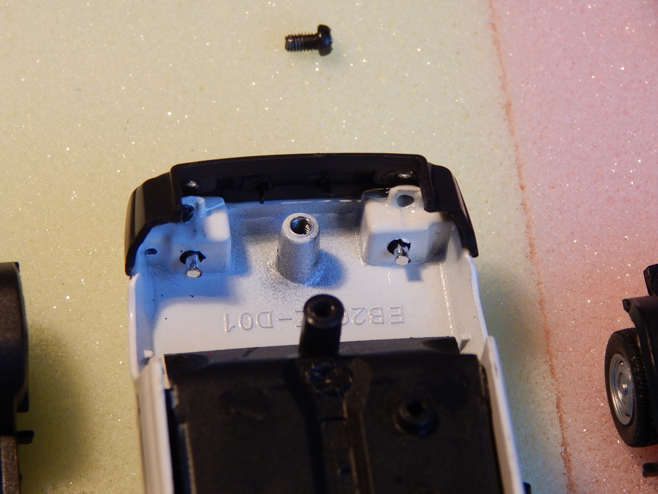Tady máš pár fotek, snad Ti pomůžou. Zadní šroubek tam jsem neměl problém , když pominu jeden šroub s totálně strženou hlavou a už jsem koketoval s myšlenkou to odvrtat. Předek je dost na těsno. Mě funguje chytit podvozek za přední kola a kolébavým pohybem a tahem kolmo od kastle a pustí se to. Při této operaci se hýbe i přední nárazník ale zatím se mi nestalo že bych ho utrhnul a to by se zas tak moc nestalo, musel by se přilepit. Bacha ale na kolečka u BLACK LINE ! Tam držet opatrně jinak se ráfek utrhne ze špic. Ty alu kola maj hrozně křehký.